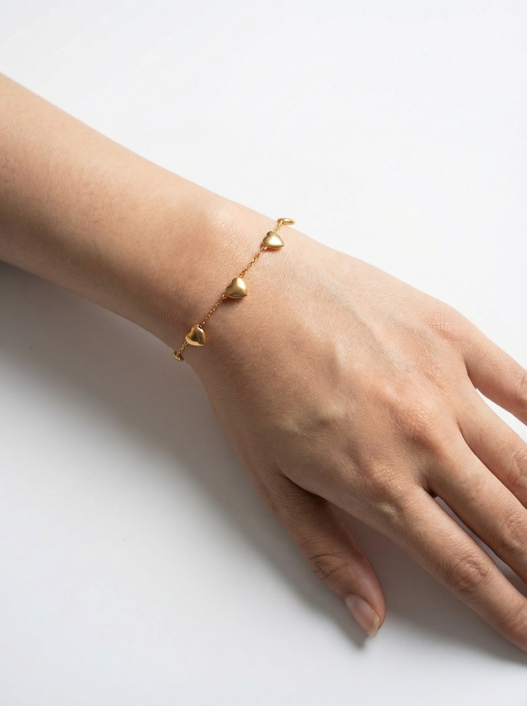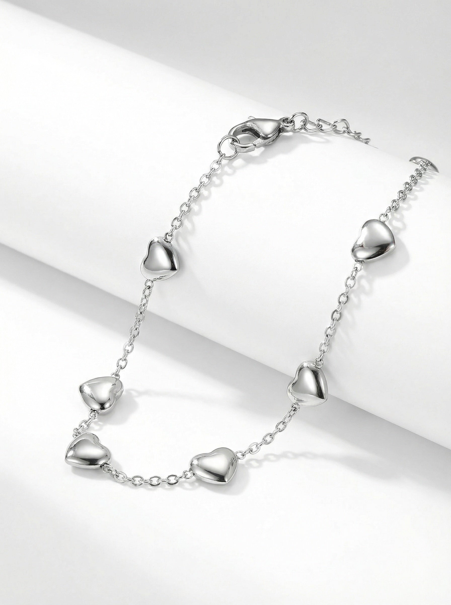 Pulsera en acero inoxidable con delicados corazones de acabado pulido que reflejan la luz con un brillo suave y elegante.